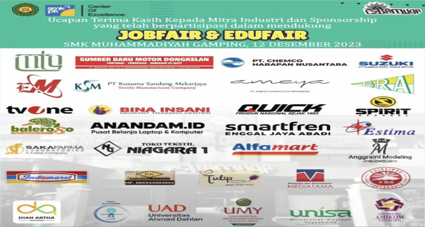 Alhamdulillahirobil’alamin… Berkat karunia serta nikmat Allah SWT, akhirnya segala rangkaian acara JobFair dan Edufair Eskamuga 2023 di SMK Muhammadiyah Gamping berjalan dengan lancar.